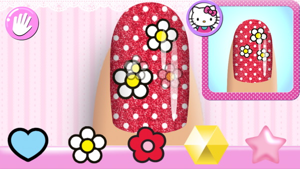 子ども向けアプリ「ハローキティネイルサロン」は、ハローキティのお店でネイルアートをして、スーパースターネイルデザイナーを目指すというものです。