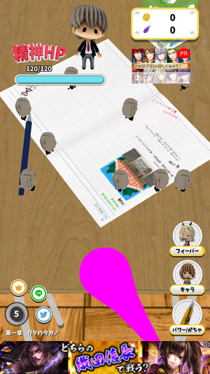 画面下の紫色の円の部分を引っ張って発射するのですが実際に飛んで行くのは「なほちゃん」で、上から見ると髪の毛の色も割りと似通っているので、最初ちょっとわかりにくいかもしれません。