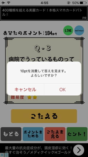 ただし「5割の大人が解けない脳トレIQなぞなぞ」でヒントを見る場合、「ポイント」を消費することになるので、全ての問題に挑戦したいという場合は、なるべくポイントを温存しておくといいかもしれません。