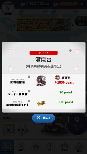 チェックインしたエリアに応じて、そのエリアに存在する在野武将を登用できます。