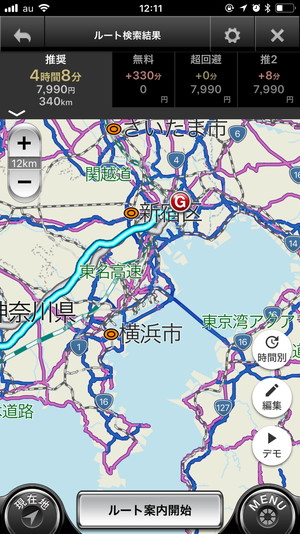 ルート検索は、「推奨」「高速」「無料」の3種類で表示されますので、自分の状況に応じたルートを選択することができます。
