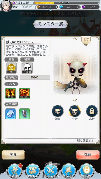 ここでは装備品の進化素材が入手出来るので、戦闘力強化に欠かせないコンテンツなのですが、ここで戦う相手は推奨戦闘力が高く設定されており、初級や中級の相手でも少々手こずる場面が何度かありました。