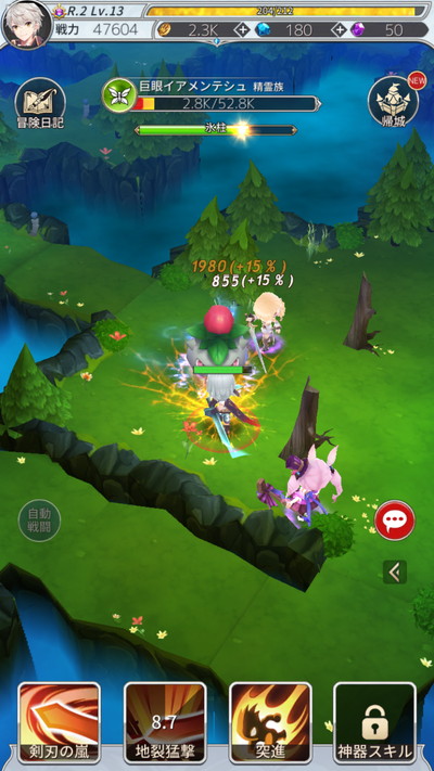 ここでもキャラクターが自動で戦ってくれるのでダンジョンと比べてあっさりした印象ですが、スキル強化に使う魔導書の欠片やガチャなどで使うダイヤが報酬として獲得出来るので、ダンジョン攻略の助けにもなるコンテンツです。