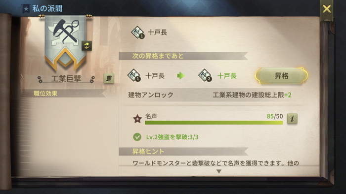 特定の条件を満たし、名声を増やすことによって派閥のランクアップを行うことができます。