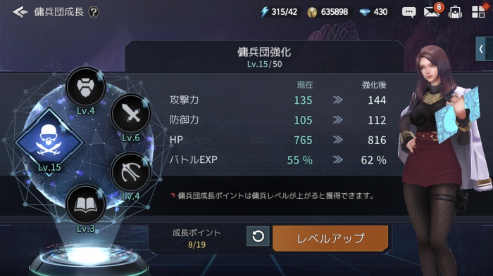 クエストをクリアして貯めたポイントで、傭兵団を強化可能です。
